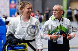 Urska Torkar of Slovenia and coach Brane Vuzem in Women’s +78 kg category during Ljubljana European Open 2025 Judo Tournament in Ljubljana, Slovenia on February 8, 2025