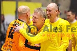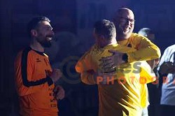 Jure Blazevic and players of MRK Krka celebrate win in Semifinal of Slovenian Handball Cup between MRK Krka and RK Celje Pivovarna Lasko in Ljubljana, Slovenia on April 4, 2025. Photo: Filip Barbalic