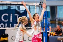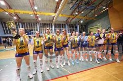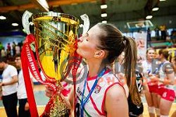 Iza Mlakar and players of OTP banka Branik celebrate Slovenian National Volleyball Title in Kamnik, Slovenia on April 30, 2025