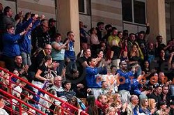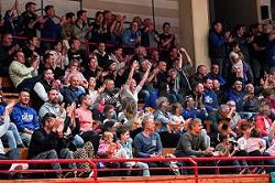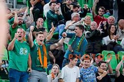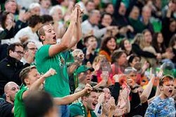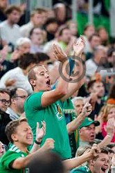 Fans of Cedevita Olimpija cheering during BKT EuroCup 2025-2026 basketball match between Cedevita Olimpija (SLO) and Aris Thessaloniki Betsson (GRE) in SRC Stozice, Ljubljana, Slovenia on October 14, 2025