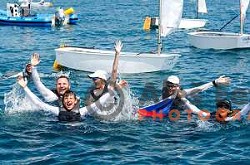 Mihael Zobec (SLO) celebrate silver medal with friends after Final day of sailing competition at 2025 Optimist World Championship in Portoroz, Slovenia on July 5, 2025