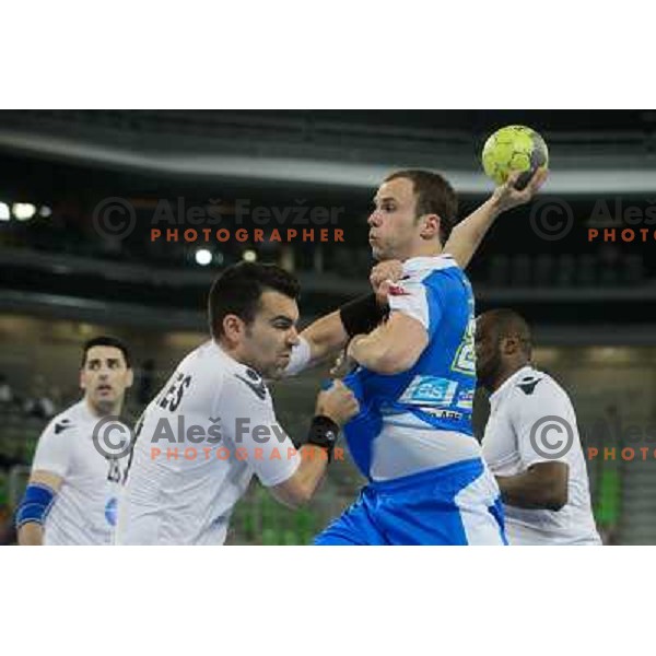 Description: Boris Denic, Matej Gaber in action during handball game Slovenia- Portugal, Handball World championship 2013 Qualifier, Stozice Arena, Ljubljana, 09.06.2012