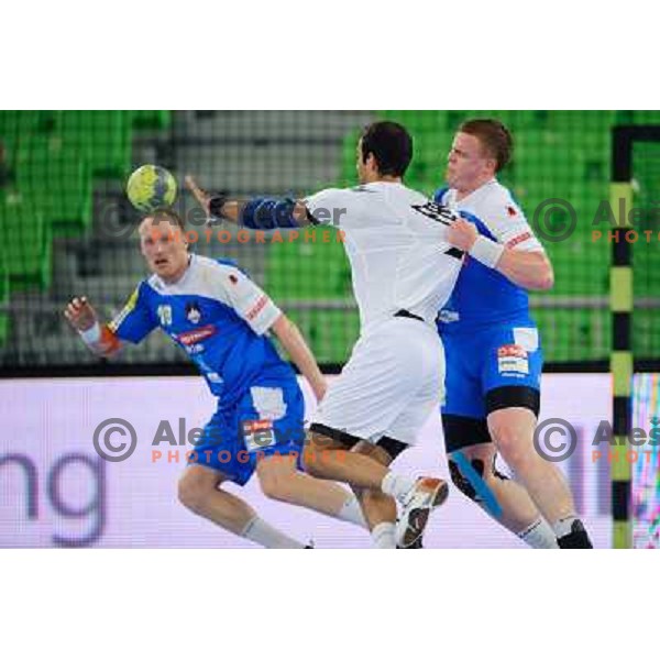 Description: Dragan Gajic, Roman Bezjak, Borut Mackovsek in action during handball game Slovenia- Portugal, Handball World championship 2013 Qualifier, Stozice Arena, Ljubljana, 09.06.2012