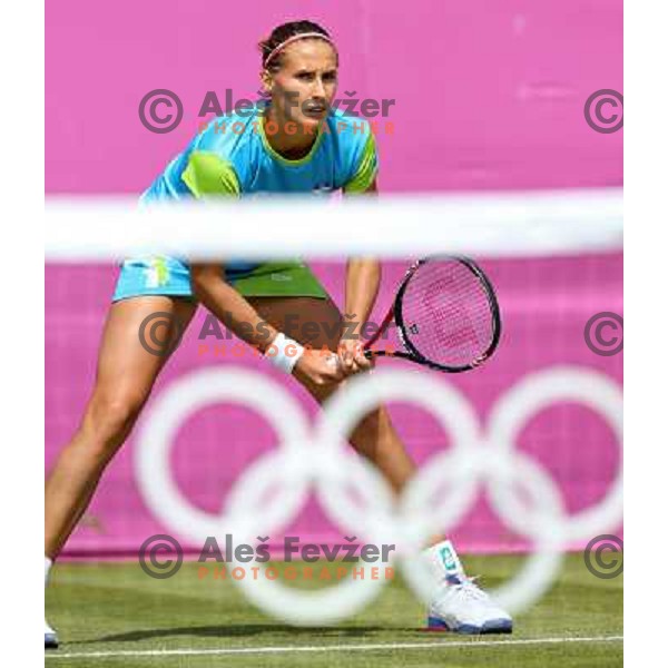 Description: Andreja Klepac of Slovenia in action in first round of women\'s doubles tennis tournament in Wimbledon during London 2012 Summer Olympic Games, Great Britain on July 30, 2012