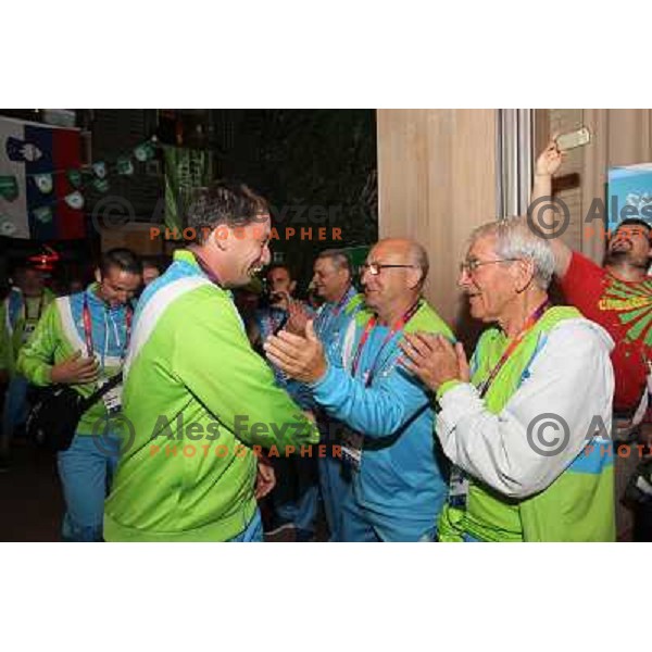 Description: Primoz Kozmus of Slovenia, Olympic silver medalist in hammer throw celebrates his medal with fans in Slovenia pub in Camden during London 2012 Summer Olympic games, Great Britain on August,6 2012