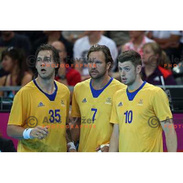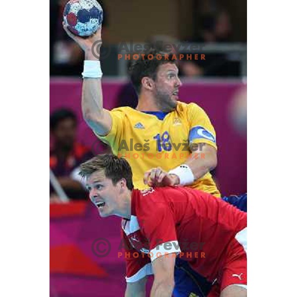 Description: Karlsson of Sweden in action during handball quarter-final match between Sweden and Denmark at London 2012 Olympic games on August 8 ,2012