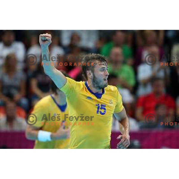 Description: Sjostrand of Sweden in action during handball quarter-final match between Sweden and Denmark at London 2012 Olympic games on August 8 ,2012