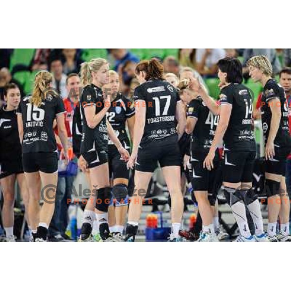 Description: Barbara Lazovic, Susann Muller, Linea Thorstensson of Krim in action during handball match Krim Mercator - U Jolidon Cluj in EHF Champions league, played at Stozice Arena, Ljubljana, Slovenia on October 14, 2012