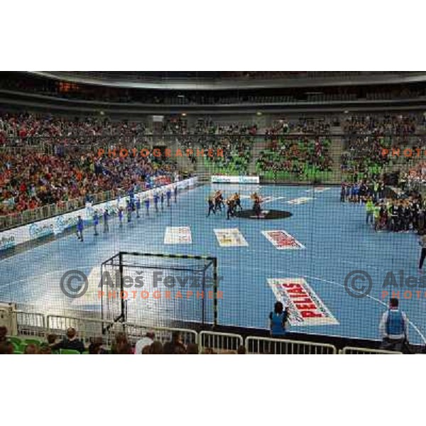 Description: Players of Krim Mercator during semi-final match of EHF Women\'s Champions league between Krim Mercator (SLO) and Larvik (NOR), played in Stozice Arena, Ljubljana, Slovenia on April 13, 2013