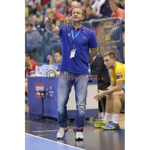 Description: Coach of Vezsprem in action during handball match Celje PL. -Vezsprem in EHF Champions League, played in Zlatorog Hall, Celje, Slovenia on November 17, 2013