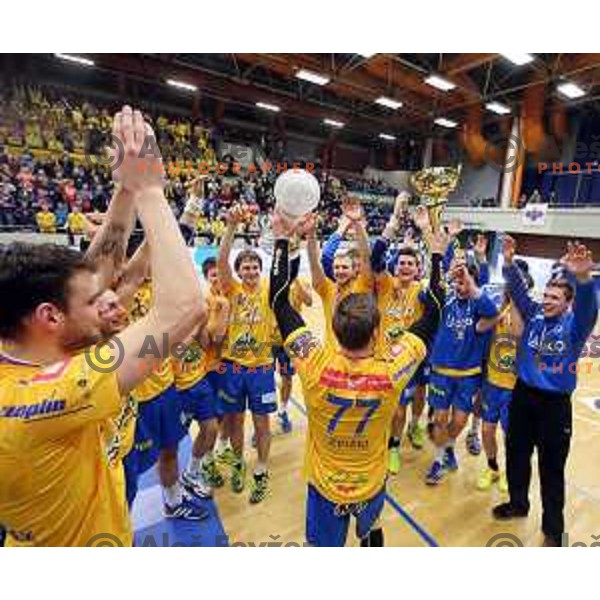Description: Luka Zvizej, Borut Mackovsek and Players of Celje PL celebrate victory at Slovenian Cup Final in Golovec Hall, Celje, Slovenia on March 2, 2014
