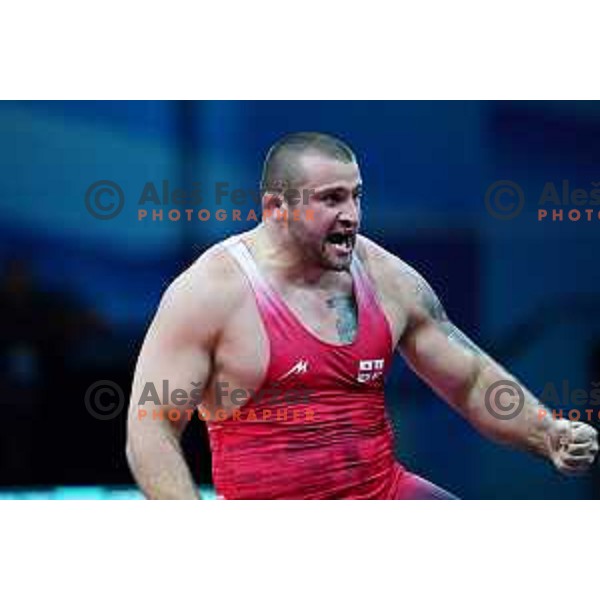Description: Aliaksandr Hrabovik (BLR) fights in Wrestling Greco-Roman Style 97 kg in Dvorec Sporta at 2nd European Games, Minsk, Belarus on June 29, 2019