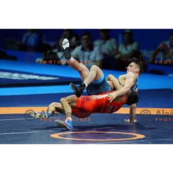 Description: Stepan Maryanyan (RUS) fights with Erik Torba (HUN) in Wrestling Greco-Roman Style 60 kg in Dvorec Sporta at 2nd European Games, Minsk, Belarus on June 29, 2019